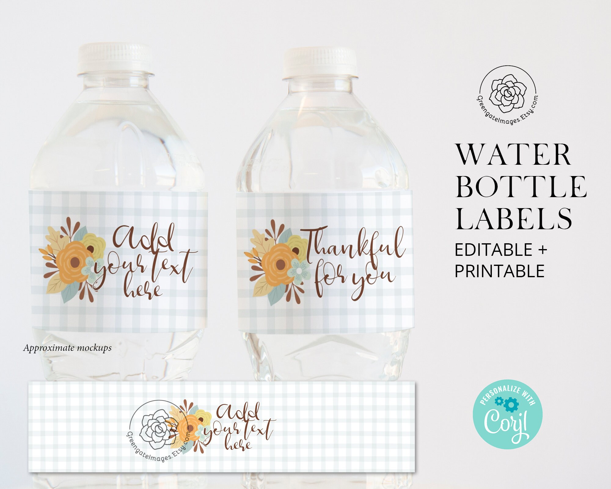 Amazon.com: thanksgiving water bottle labels Big Dot of Happiness Happy Thanksgiving - Fall Harvest Party Water Bottle Sticker Labels - Set of 20 13 Small Business Personalized Rustic Autumn Water Bottle Labels - Thanksgiving, Friendsgiving, Fall Holiday Gathering Custom Stickers - 24 Count 5 $1475 ($0.61/Count) Get it Tue, Aug 30 - Fri, Sep 2 FREE Shipping Small Business Personalize it Our Water Bottle Label Sizes - Bottle Your Brand In other words a 16.9 oz. bottle from Costco in Seattle, Washington might be a slightly different bottle shape than a 16.9 oz. bottle of Costco water in Tampa, Florida. We have two water bottle label sizes: 8.25"x1.75" and 8"x2.125".